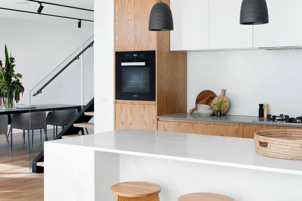 Küchen mit Kücheninseln sind ideal für Familien, da sie es ermöglichen, die Kinder während der Arbeit in der Küche im Auge zu behalten und gleichzeitig am Familienleben teilzunehmen. Moderne Tipps sorgen dafür, dass sich Gerüche nicht im Raum verbreiten und ein angenehmes Klima entsteht. Dank leiser Elektrogeräte stören Sie die Spülmaschine und andere Einbaugeräte in Ihrem Wohnzimmer nicht.